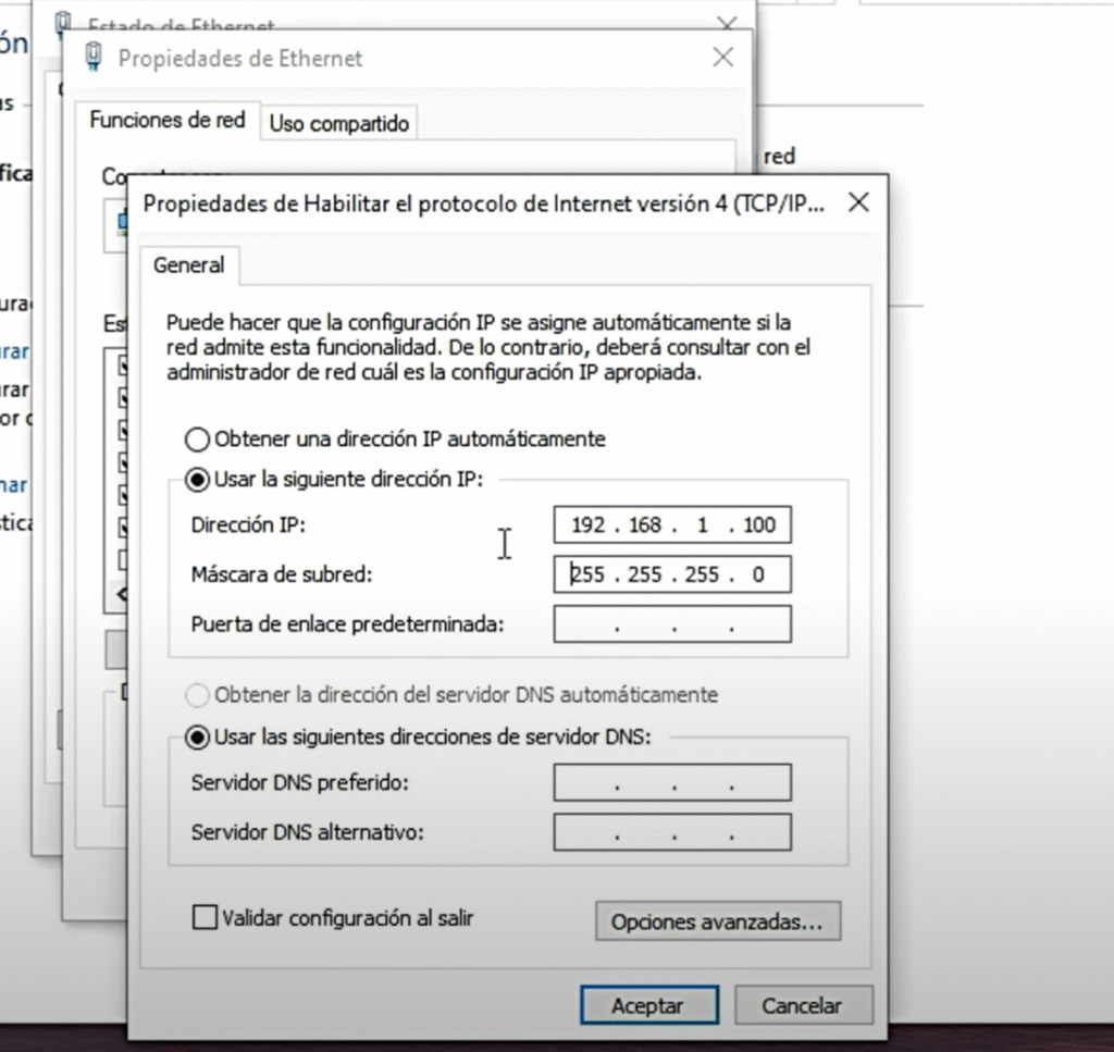 Ahora debemos proceder a cambiar nuestra dirección ip estática en nuestro panel de administración de la pc, ya que aplicamos los cambios y cambiamos la ip de administración de la antena, por lo que ya no nos deja acceder a las opciones de administracion de la red.