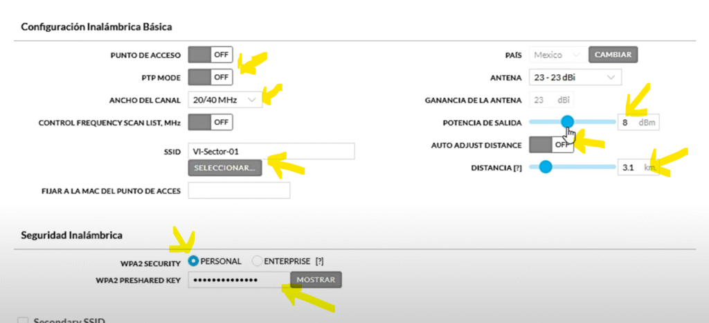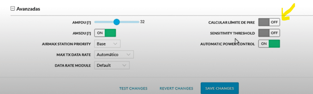 Ahora nos vamos a la configuración de CALCULAR LIMITE DE PIRE y la desactivamos, con esto podemos aumentar la potencia de salida a nuestra necesidad y en la opción de AUTO ADJUST DISTANCE lo desactivamos, en DISTANCIA le asignamos una distancia un poco alejada de la distancia a la que está nuestro cliente.