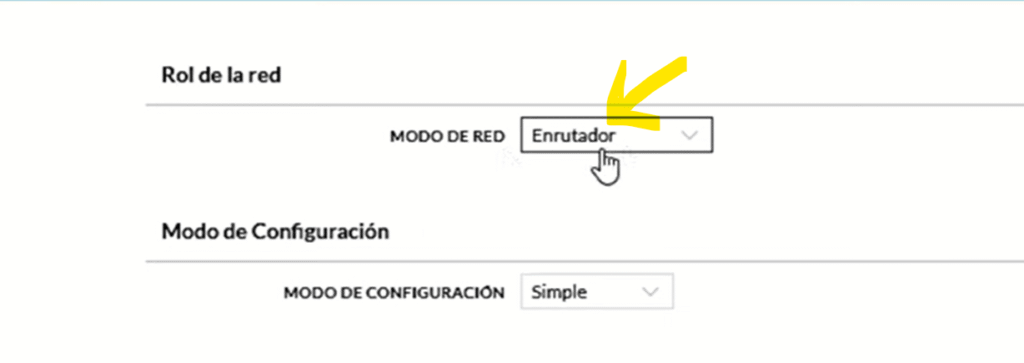 Aplicados los cambios del paso anterior, nos situamos en la opción de RED y en la opción de MODO DE RED seleccionamos enrutador, ya que queremos que la antena funcione como un router y que sea la antena quien administre la red del cliente final, así nosotros como proveedores de internet podemos tener mayor control.