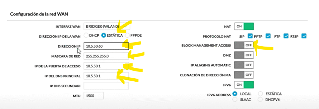 La opciónde BLOCK MANAGMENT ACCESS lo desactivamos y nos pasamos a la CONFIGURACIÓN DE LA RED LAN, esta es la configuración de la red que nuestra antena le va a ofrecer a nuestro cliente y sus dispositivos que se conecten.