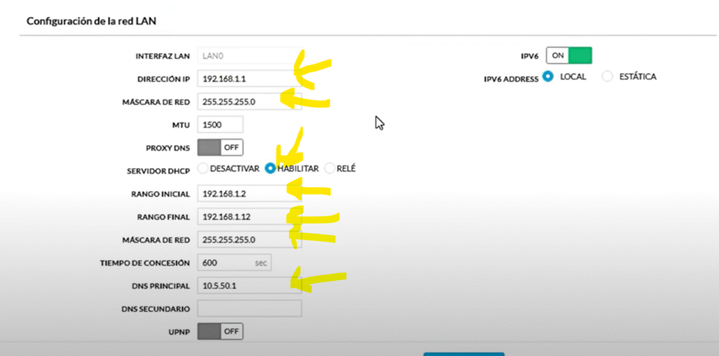 En DNS PRINCIPAL debe ser la ip de nuestro router principal o también puedes poner los DNS de Google y con eso finalizamos el apartado de RED, en mi caso le pongo la ip 10.5.50.1.